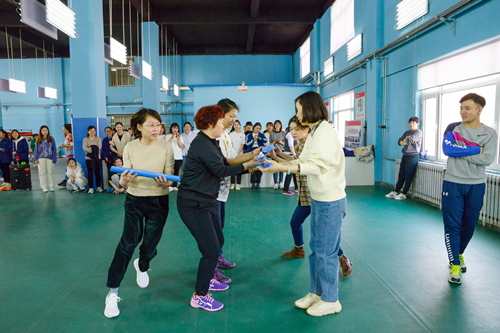 U型槽能量传输游戏,12组队伍参赛。从一开始不停地捡球、跑错位,到最后每一个小组都像一根链条一样,各个环节默契有加。