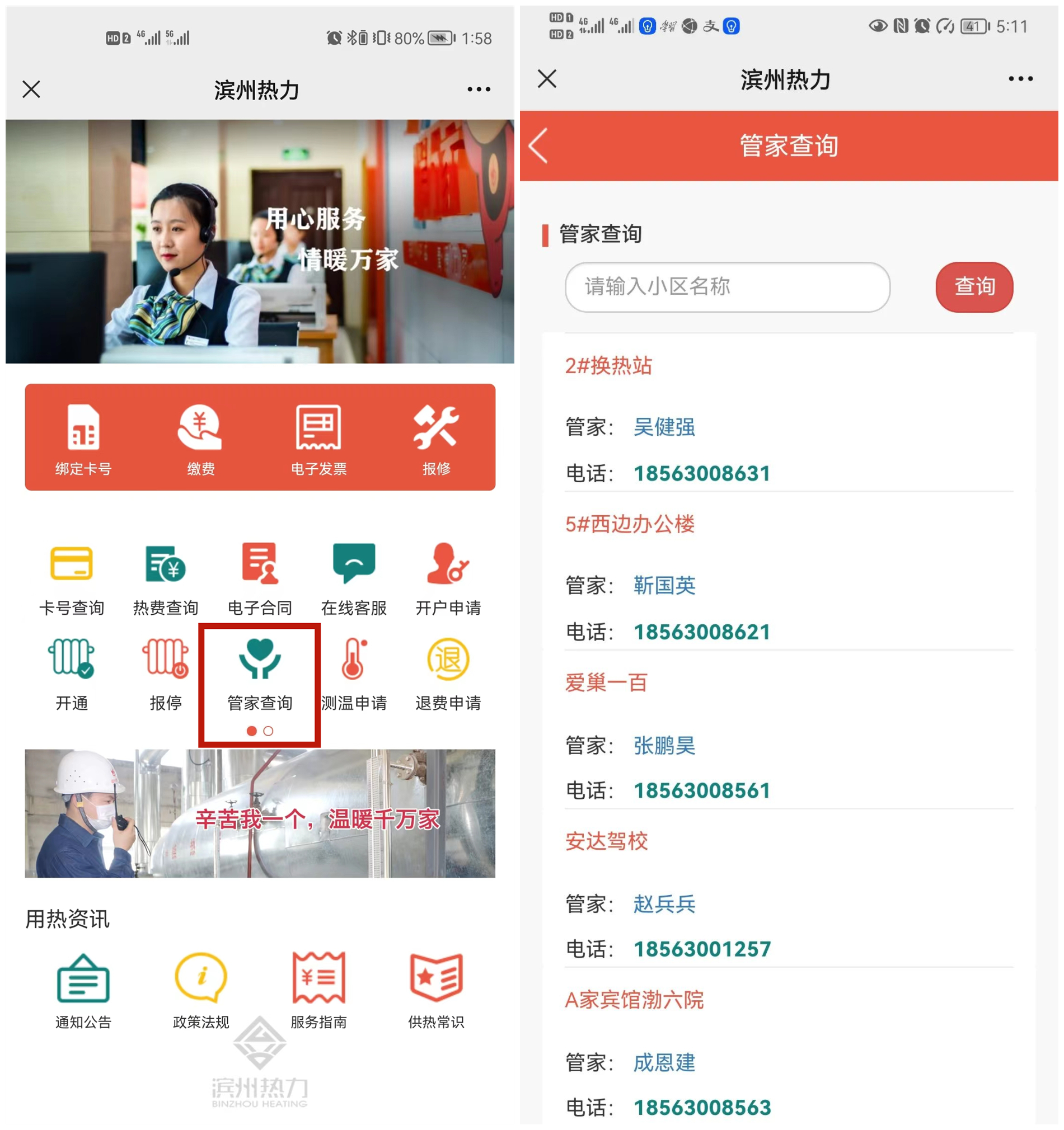 三、在线客服 1、滨州热力有限公司网站(www.bzgr.cn)选择“在线咨询”。 2、登录滨州供热APP,点击在线客服。 3、关注滨州热力有限公司微信公众号选择“在线服务”—“在线客服”。 4、QQ搜索“800181086”,联系在线客服四、供热管家服务电话 关注滨州热力微信公众号,点击“在线服务”,进入页面后,点击“管家查询”,输入小区名称即可查询。